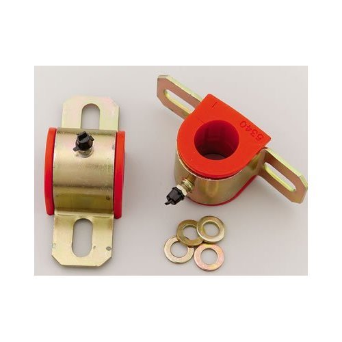 This red greaseable front sway bar bushing set improves handling and is ideal for cars, trucks, and sport utility vehicles. Working with sway bar end links, the sway bar bushings make the sway bar system more effective through the use of firmer components. The set includes zinc and gold irradiate-plated 3/8" bolts, nylon insertlock nuts, heavy gauge washers, and mounting brackets.